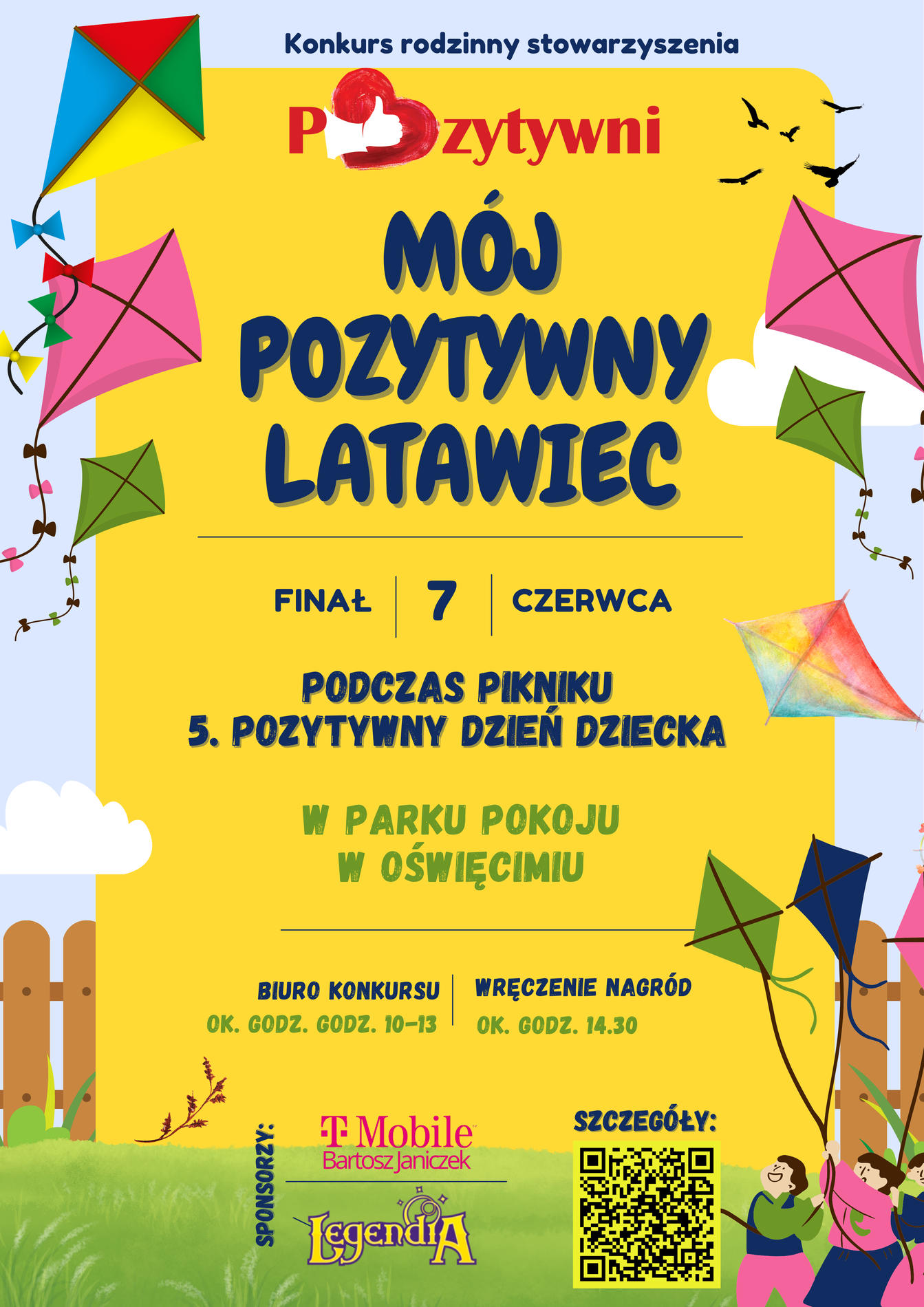 Stowarzyszenie Pozytywni zaprasza do udziału w rodzinnym konkursie plastycznym „Mój Pozytywny Latawiec”. Uczestnicy mają za zadanie stworzyć autorskie latawce. Nagrodą główną jest smartfon Samsung ufundowany przez salon T-MOBILE, znajdujący się w galerii Niwa w Oświęcimiu. Trzy pierwsze ekipy otrzymają też rodzinne zaproszenia do Legendii – Śląskiego Wesołego Miasteczka. To atrakcja numer 1 na Śląsku i zarazem największy tematyczny park rozrywki w Polsce.